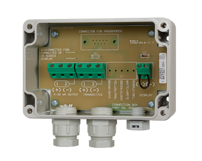 Kopplingslådan används med fördel som skarvdosa till nivågivare. Den är utrustad med plintar för anslutning av givarens kabel och med plintar för anslutning av den egna kabeln.